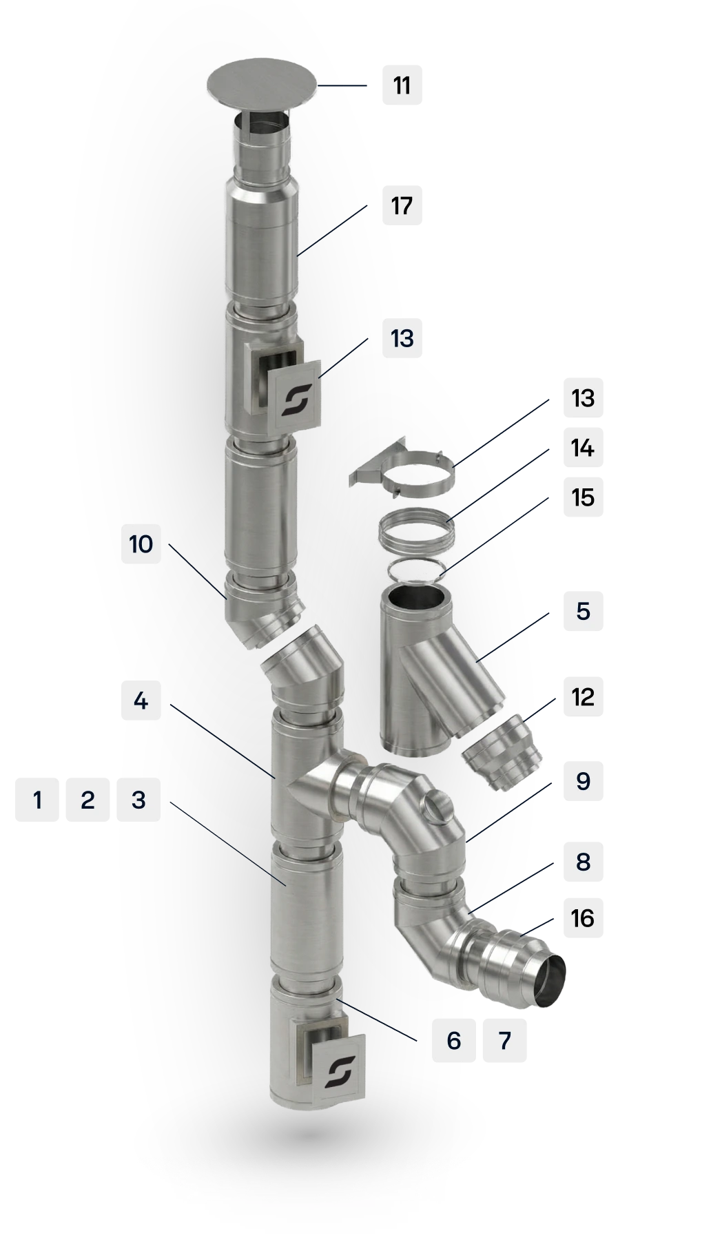 Shema prikazuje modularno strukturo sistema SIGMA TERM, ki z 17 certificiranimi komponentami omogoča poljubne konfiguracije dimniških vertikal glede na specifične zahteve objekta. Celovit nabor standardiziranih elementov zagotavlja projektantom popolno tehnično predvidljivost, hitro specifikacijo materialov ter brezhibno tesnost celotnega sistema.